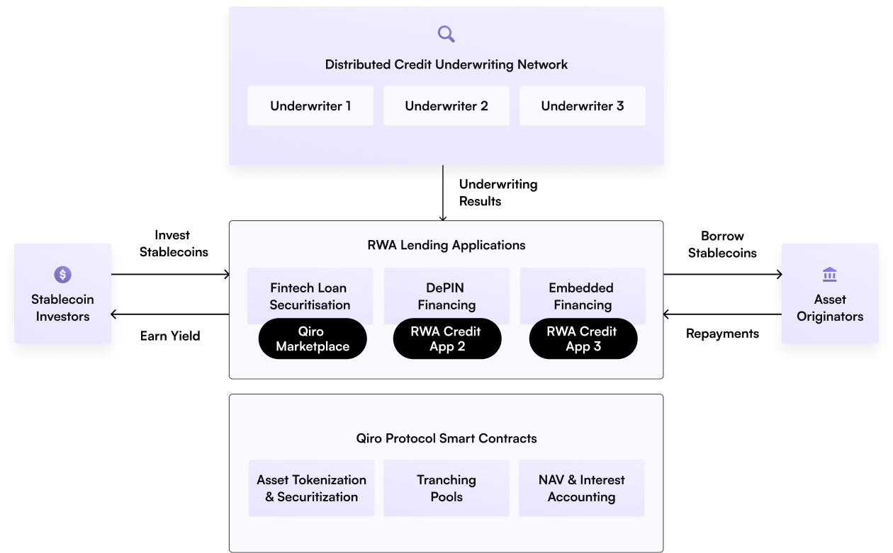 Qiro is developing a decentralised private credit protocol with the capability to facilitate a wide range of tokenised private credit . This is achieved by unifying asset originators, stablecoin investors, and credit underwriters under a single framework.